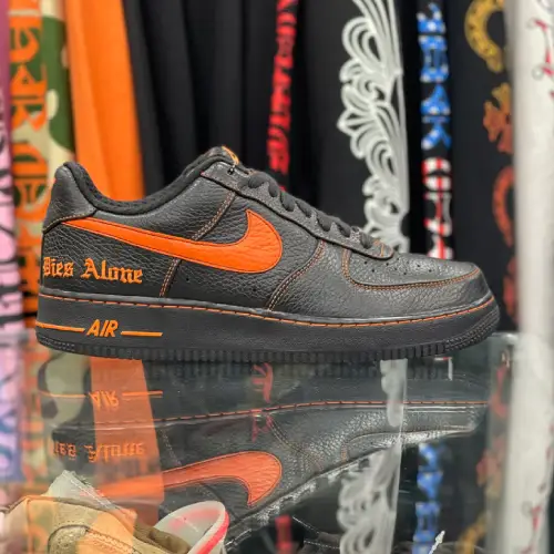 The 2017 VLONE x Nike Air Force 1 Low stands as one of the most sought-after streetwear collaborations of the decade. Released in extremely limited quantities, this sneaker features a black premium leather upper accented with VLONE’s signature orange detailing. Hand-stitched slogans like “Every Living Creative Dies Alone” add a raw, rebellious edge, while the classic Air Force 1 silhouette keeps the design timeless. The bold orange Swoosh and heel branding elevate its iconic look, making it a collector’s essential. Blending exclusivity, craftsmanship, and street culture, this pair remains a legendary piece in sneaker history.